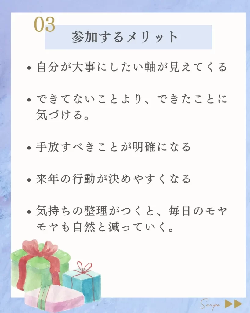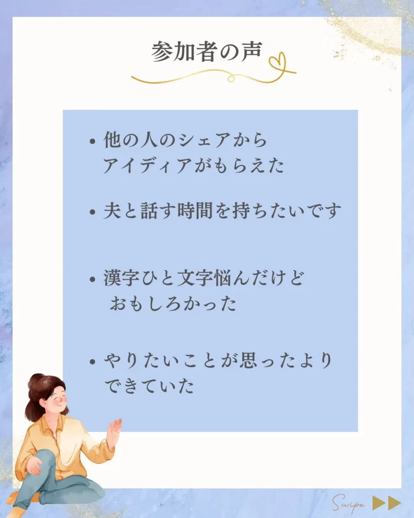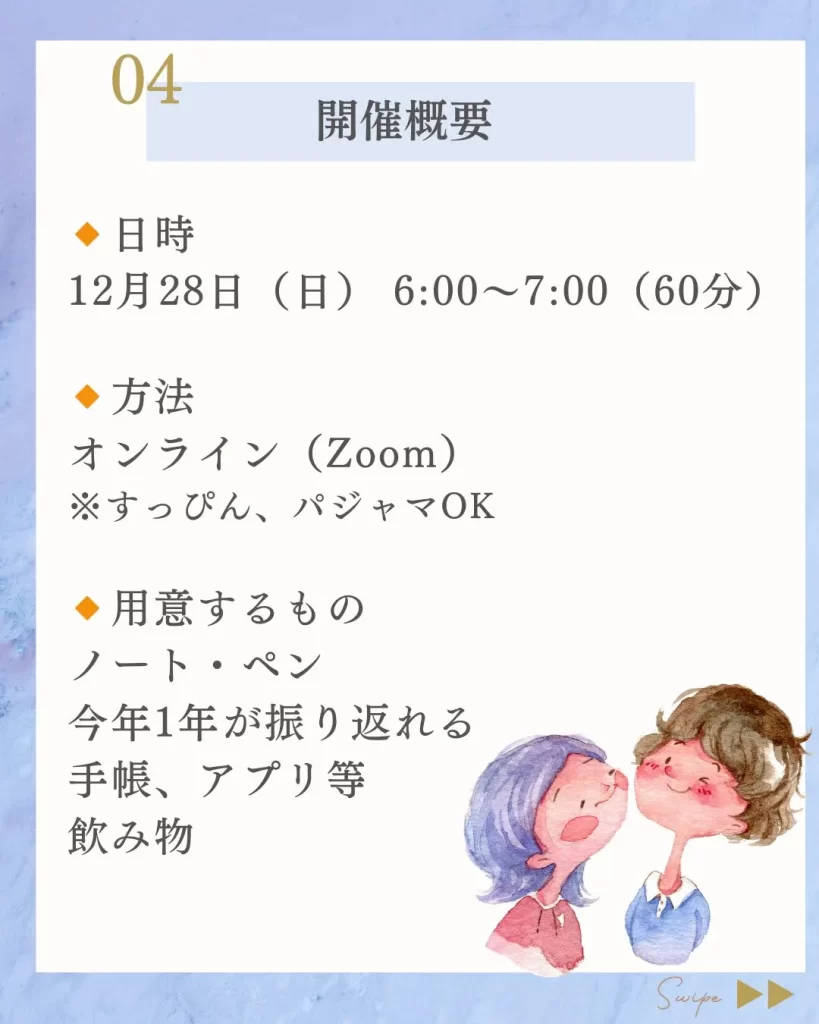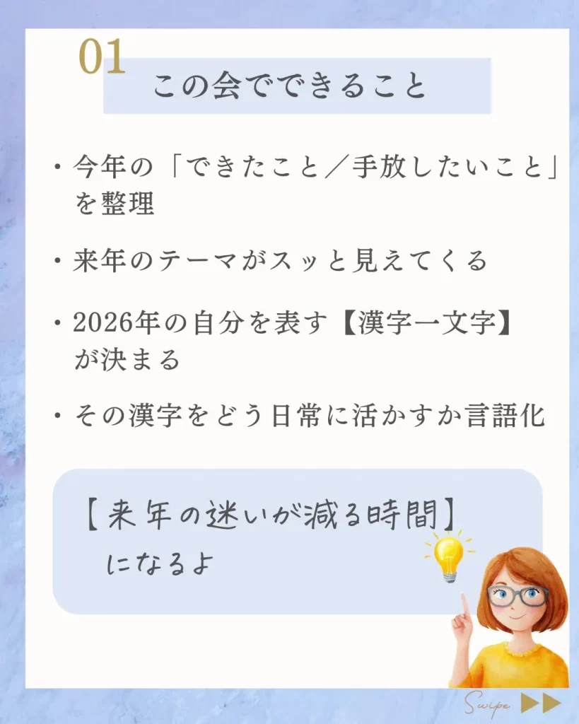 振り返り&漢字一文字づくり会のご案内 ご案内 X Facebook はてブ Pocket LINE コピー 2025.12.10 もしくは下記のフォームから申し込みください 2025振り返り→2026年の漢字一文字づくり会2025振り返り→2026年の漢字一文字づくり会 🔸 日時 12月28日(日) 6:00~7:00(約60分) 🔸 開催方法 オンライン(Zoom) 🔸 この会でできること 1年間の「できたこと・がん...
